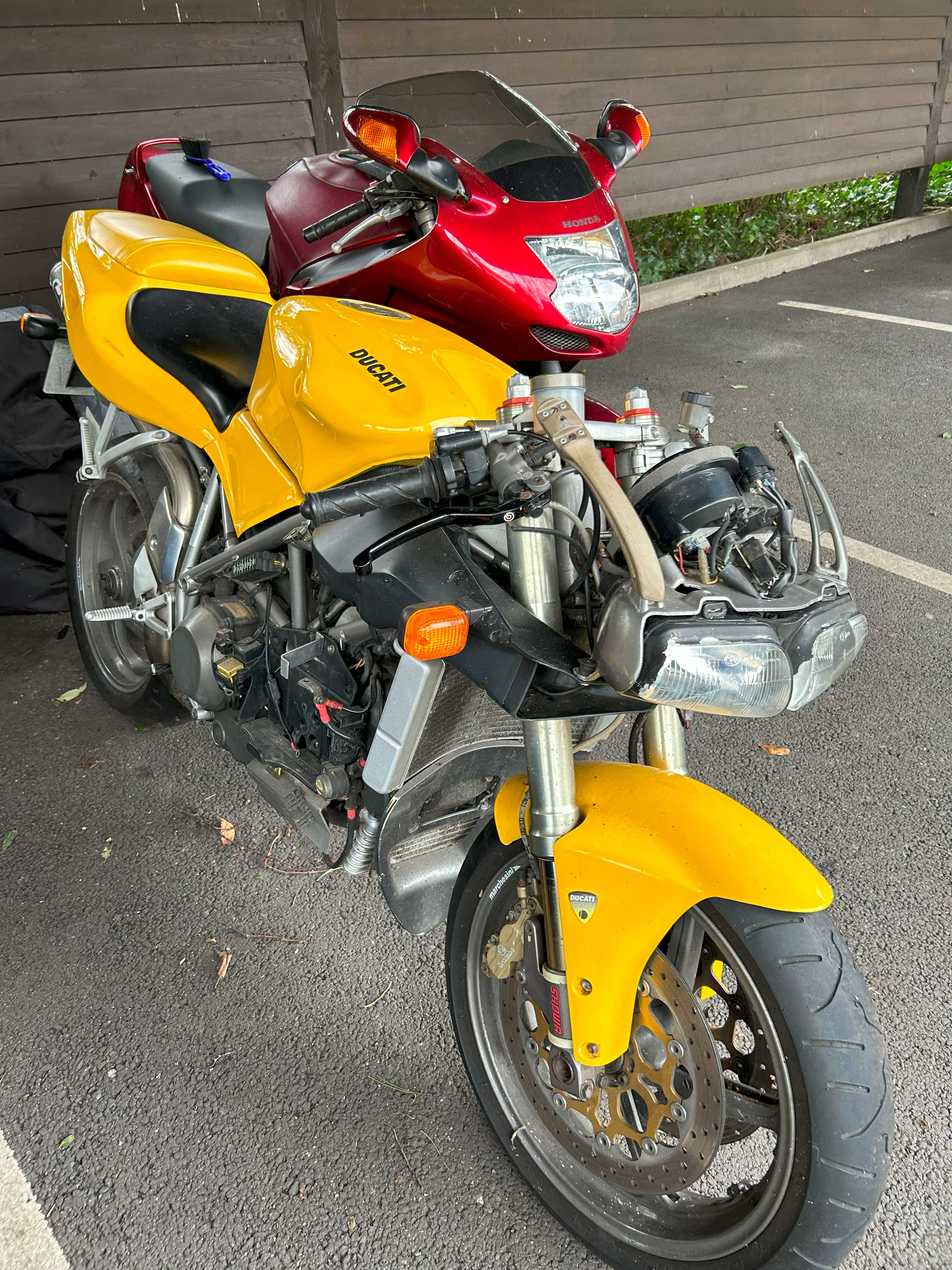 While I was back in Newmarket I had an accident. After washing my Honda Blackbird, I was returning it to it's normal parking space and failed to put the sidestand down correctly :( The Honda fell on me, I fell on the Ducati and the Ducati hit the back wheel of the Jag - ouch!