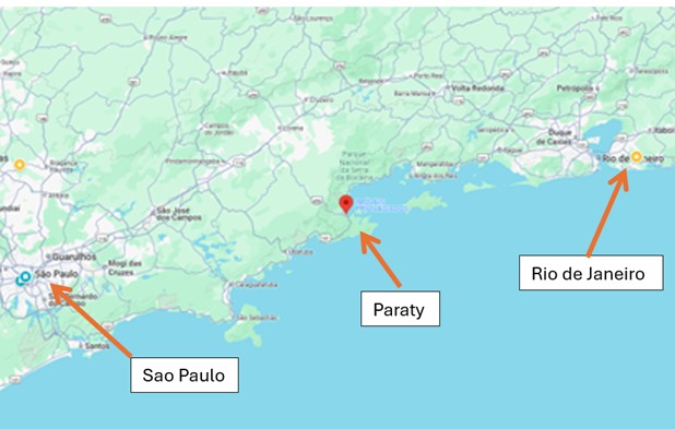 Paraty lies about halfway between São Paulo and Rio de Janeiro. While the drive is supposed to take around 4 ½ hours, that’s only possible if you leave at 2 AM; 6-8 hours or longer is the norm.