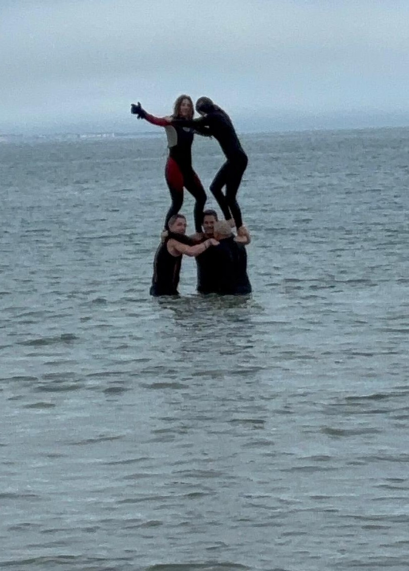 For many years now, the Kerns have upheld a Boxing Day tradition in Wareham, at the beach near Roger’s home. Despite the freezing December temperatures of the English Channel (typically 0-9°C), the family braves the cold for a swim and constructs a human pyramid! That’s Roger on the right of the base, with son-in-law Gav on his left and son Tom completing the foundation. Daughters Laura and Sophie top it off! I took part in this icy ritual a few years ago. Afterward, we all piled into Roger’s old Land Rover Defender, sped back to his house, and dove into the hot tub in the garden. My feet were so numb that I didn’t realize I’d sliced my big toe open on a shell, until I was soaking in the hot tub. What fun!